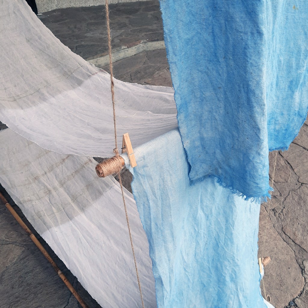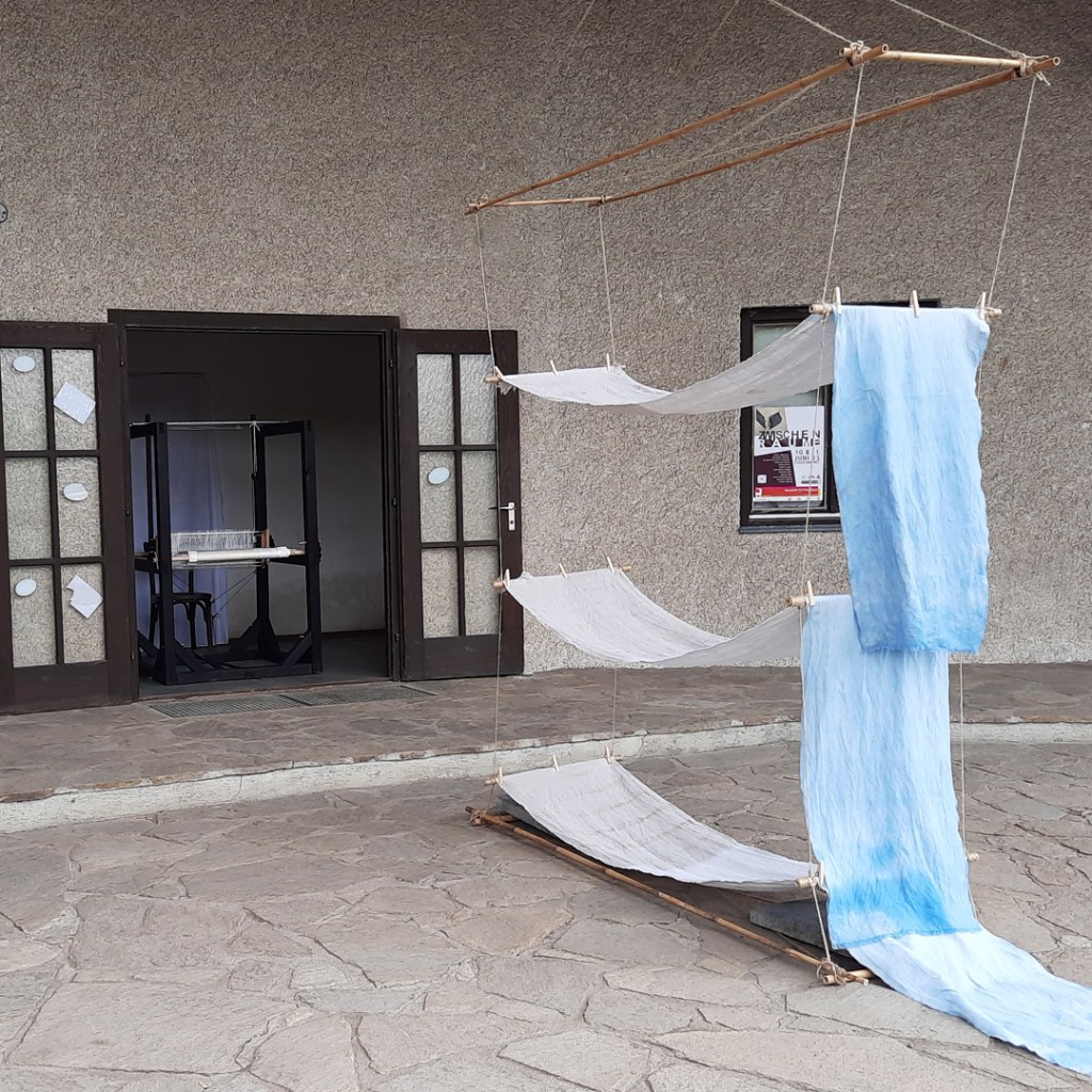 Seit dem Mittelalter bis in das 19. Jahrhundert wurden an diesem Ort Rohleinengewebe auf den Wiesen geblichen. Um dieses alte Wissen und die Bedeutung wieder sichtbar zu machen, konzipierte ich einen symbolischen textilen Arbeitsprozess.