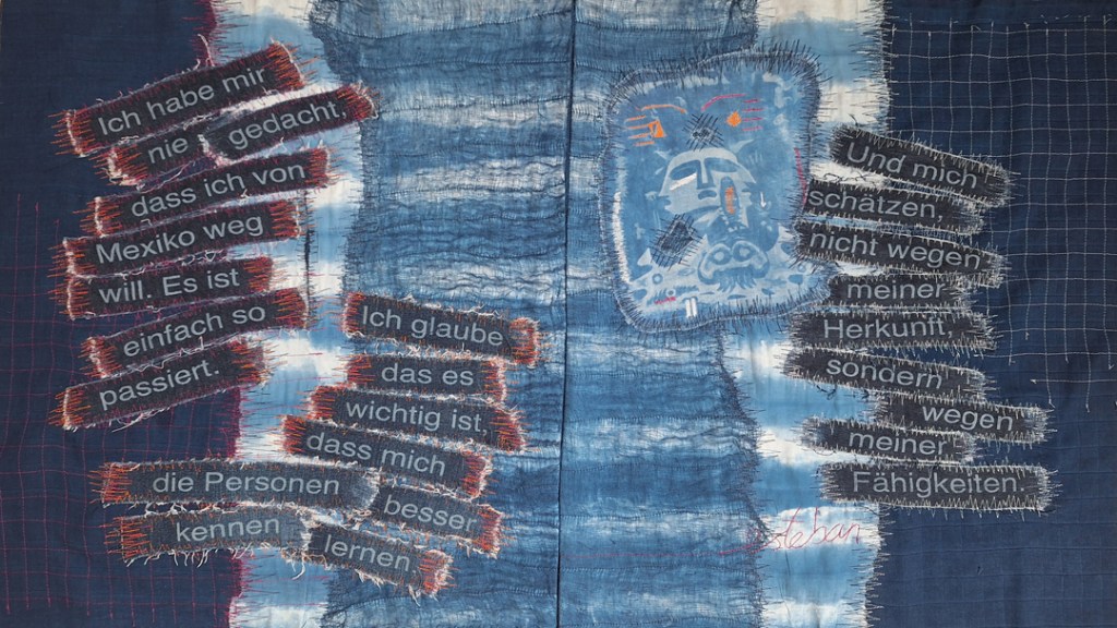 Die Textzeilen sind aufappliziert. Da es sich um Fragmente aus einem Interview handelt, wurden industriell gefertigte Baumwollstoffe in Blau und Weiß verwendet, wobei die Buchstaben mit Lasergravur in Weiß ausgeführt wurden. Dies verweist auf das digitale Archiv der Radioaufzeichnung.